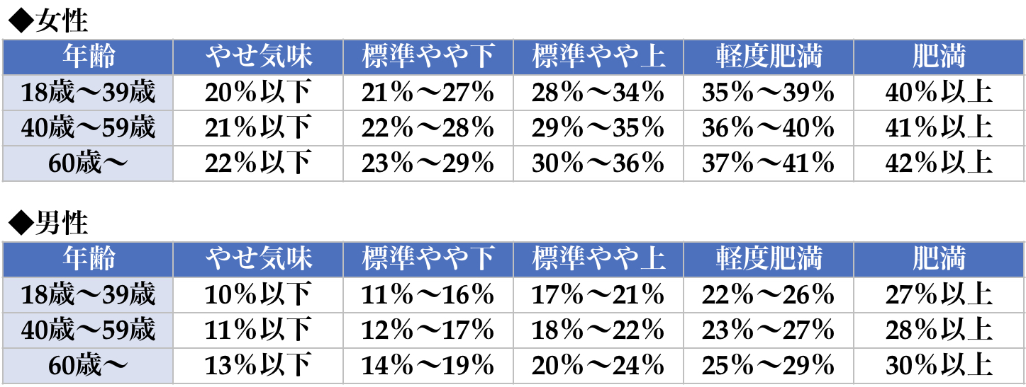 女性で30%前後、男性で20%前後が標準的な体脂肪率とされています。これよりも数字が大きい人は体脂肪が多めですので注意が必要になります。